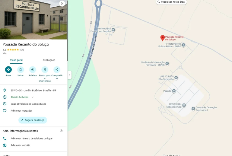 Nessa quinta-feira (11), usuários do Google Maps se depararam com uma surpresa inusitada ao buscar pelo 19º Batalhão da Polícia Militar do Distrito Federal, localizado no Complexo Penitenciário da Papuda. Entre os resultados, apareceu uma pousada fictícia chamada “Recanto do Soluço”, que faz referência ao ex-presidente Jair Bolsonaro (PL), preso desde 22 de novembro e que sofre de crises de soluços. A tag foi aparentemente criada como uma ironia à sua situação.